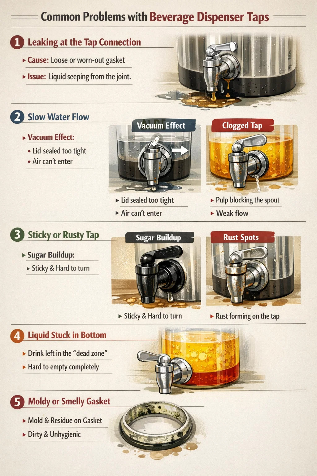 Các khu vực có vấn đề tiềm ẩn: Bên trong Vòi nước uống bằng kim loại và trong các kẽ hở của vòng đệm, cặn nước trái cây có thể dễ dàng tích tụ nếu không được tháo rời và làm sạch. Theo thời gian, những vùng này sẽ chuyển sang màu đen và bị mốc, ảnh hưởng trực tiếp đến mùi vị cũng như độ an toàn của cả mẻ đồ uống.